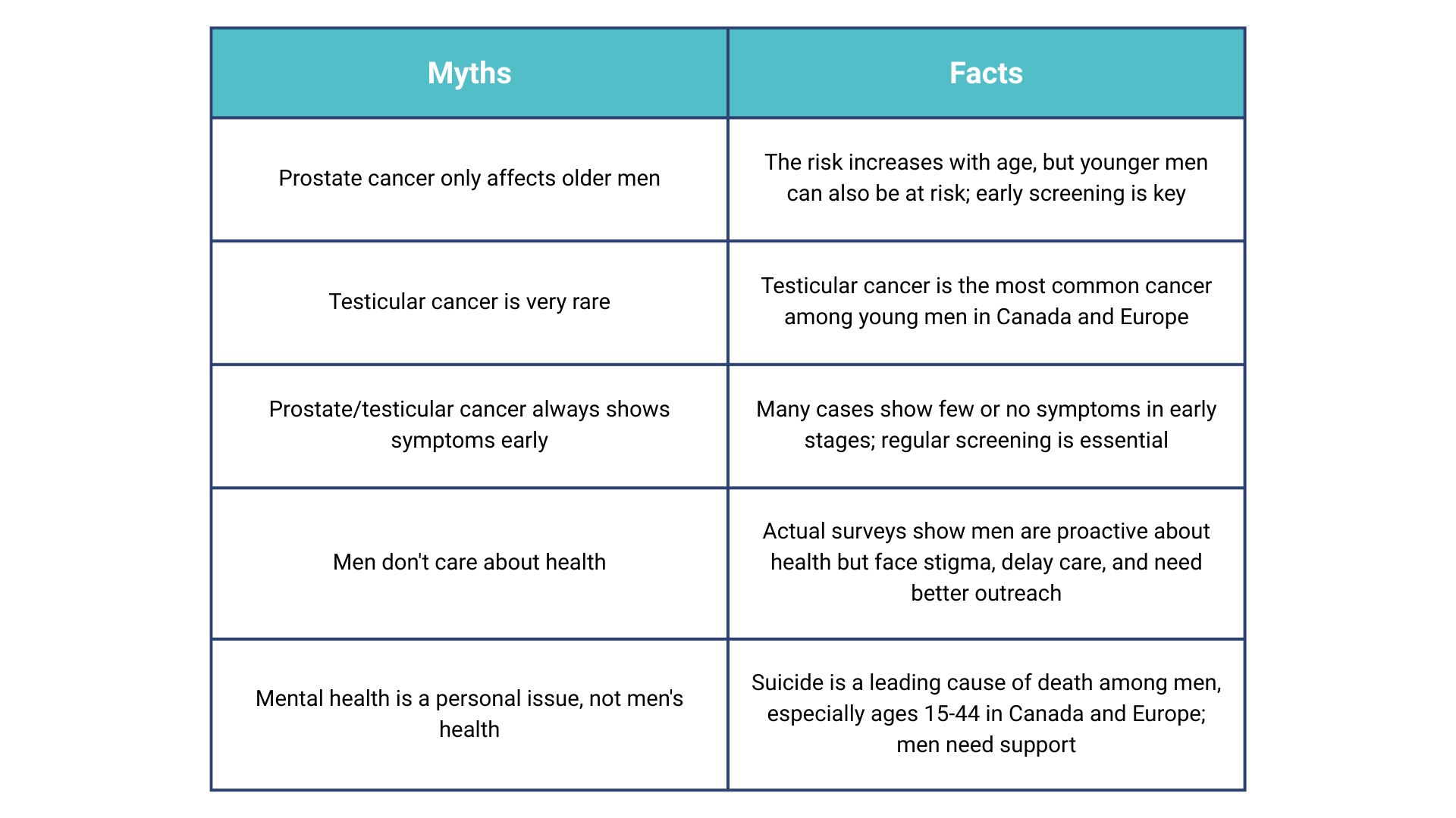 Despite Movember’s popularity, many misconceptions persist regarding men’s health issues. Let’s bust some common myths6;7;8;9;10.